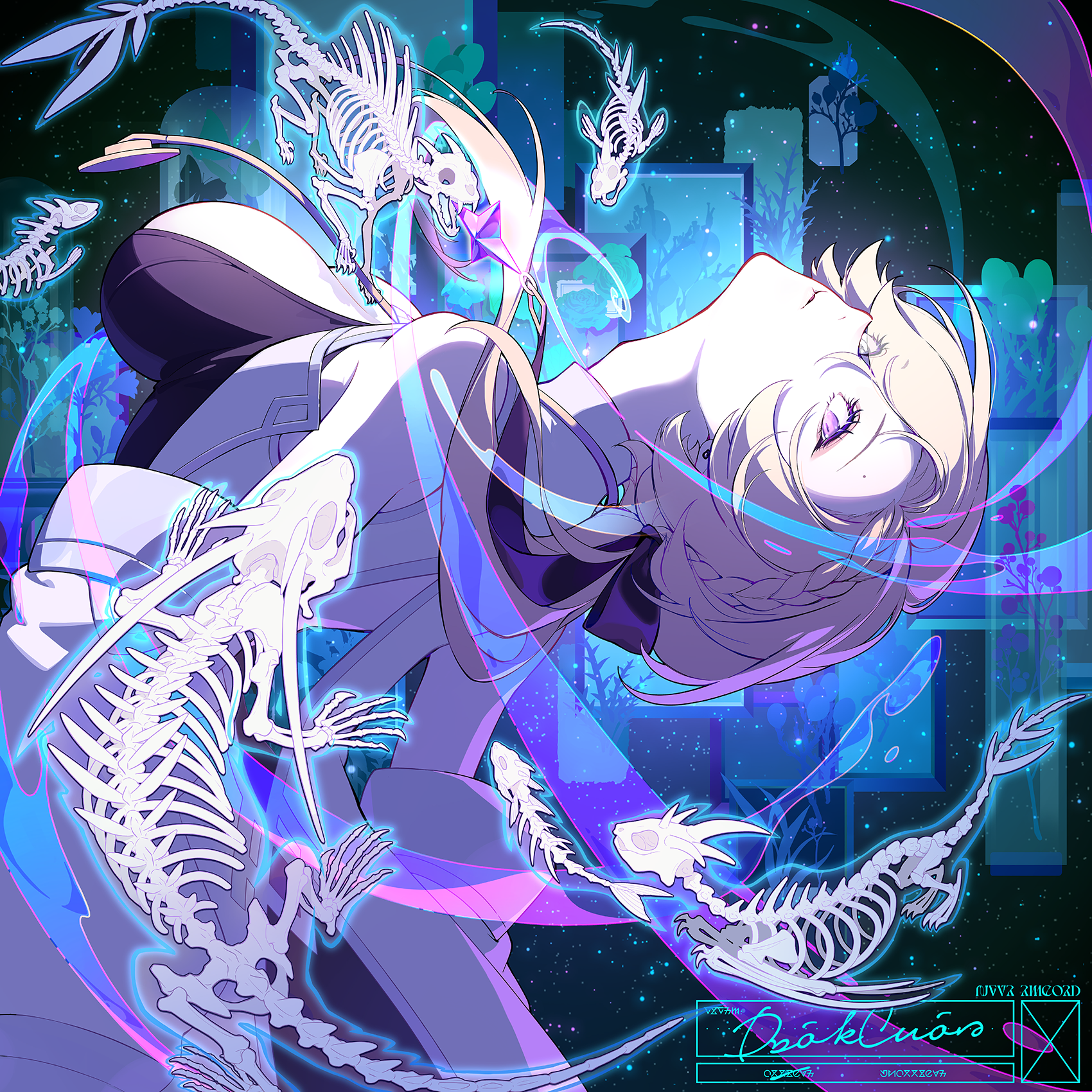 saga666, original, absurdres, commentary, highres, 1girl, asymmetrical bangs, bare shoulders, black choker, black dress, black hair, black nails, black veil, blue bow, blue eyes, blue fire, bow, candlestand, choker, corset piercing, cowboy shot, cross, cross earrings, dress, earrings, fire, frilled choker, frills, grey background, hair over one eye, hand up, heart, heart earrings, heterochromia, holding candlestand, horns, jewelry, latin cross, long sleeves, looking at viewer, multicolored nails, multiple rings, nail polish, pelvic curtain, purple eyes, purple fire, ring, short hair, single horn, skin-covered horns, skull ring, solo, spiked choker, spikes, tentacles, tongue, tongue out, veil
