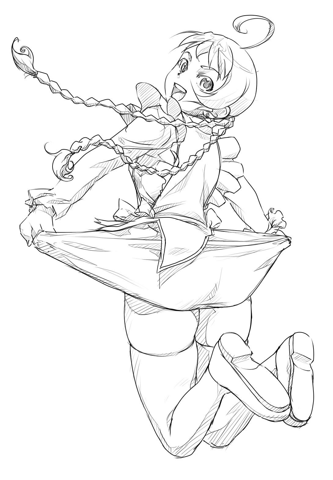 00s1girlahogebraidclothes liftfemale focusgarderobe uniformgreyscalejumpinglooking backmonochromeskirtskirt liftsolothighhighs