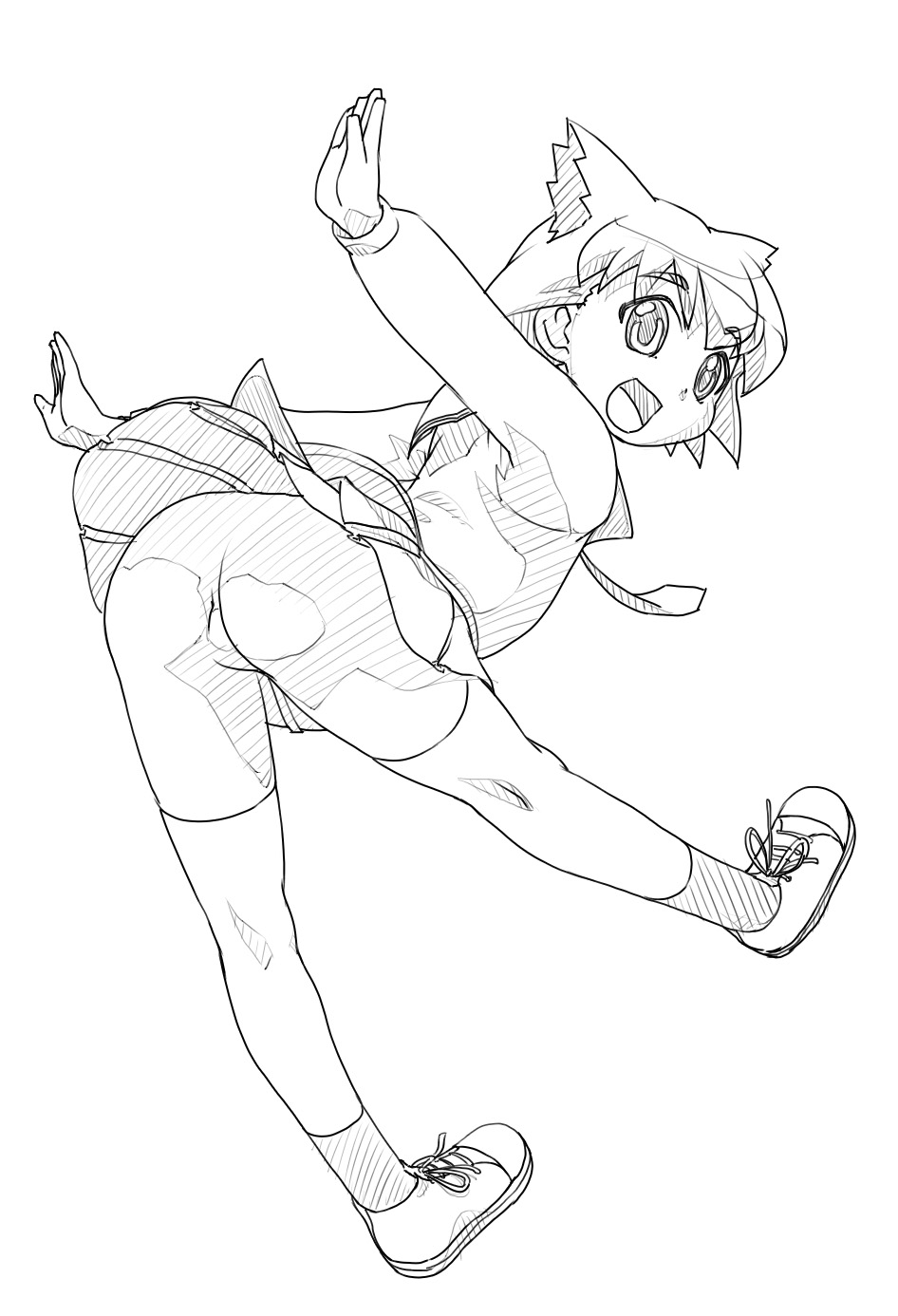 seo tatsuya, shameimaru aya, touhou, 1girl, female focus, geta, greyscale, hat, looking at viewer, monochrome, open mouth, smile, solo, tengu-geta