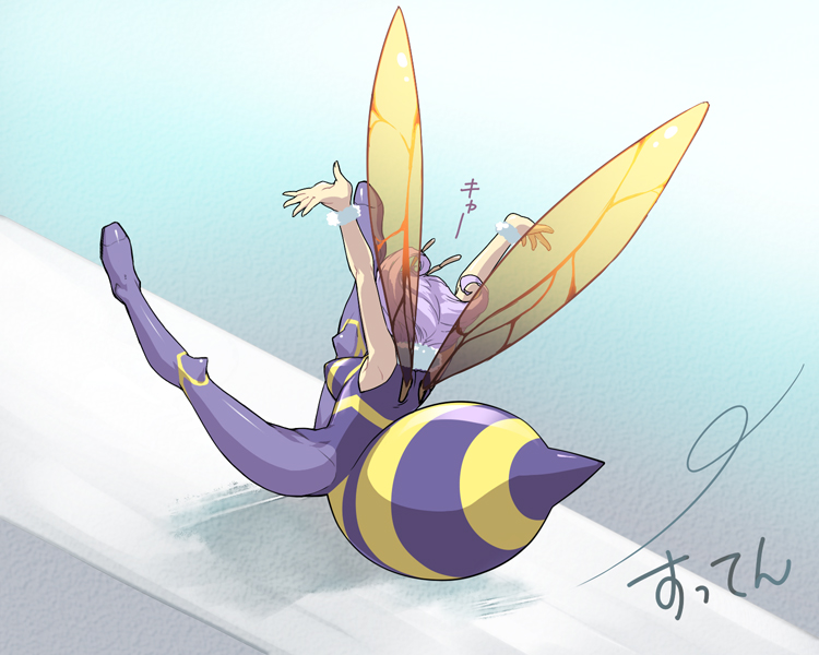 1girlantennaearthropod girlbee girlbreastsfemale focusflyinginsect girlmonster girlpantyhosepurple hairshort hairsolowings