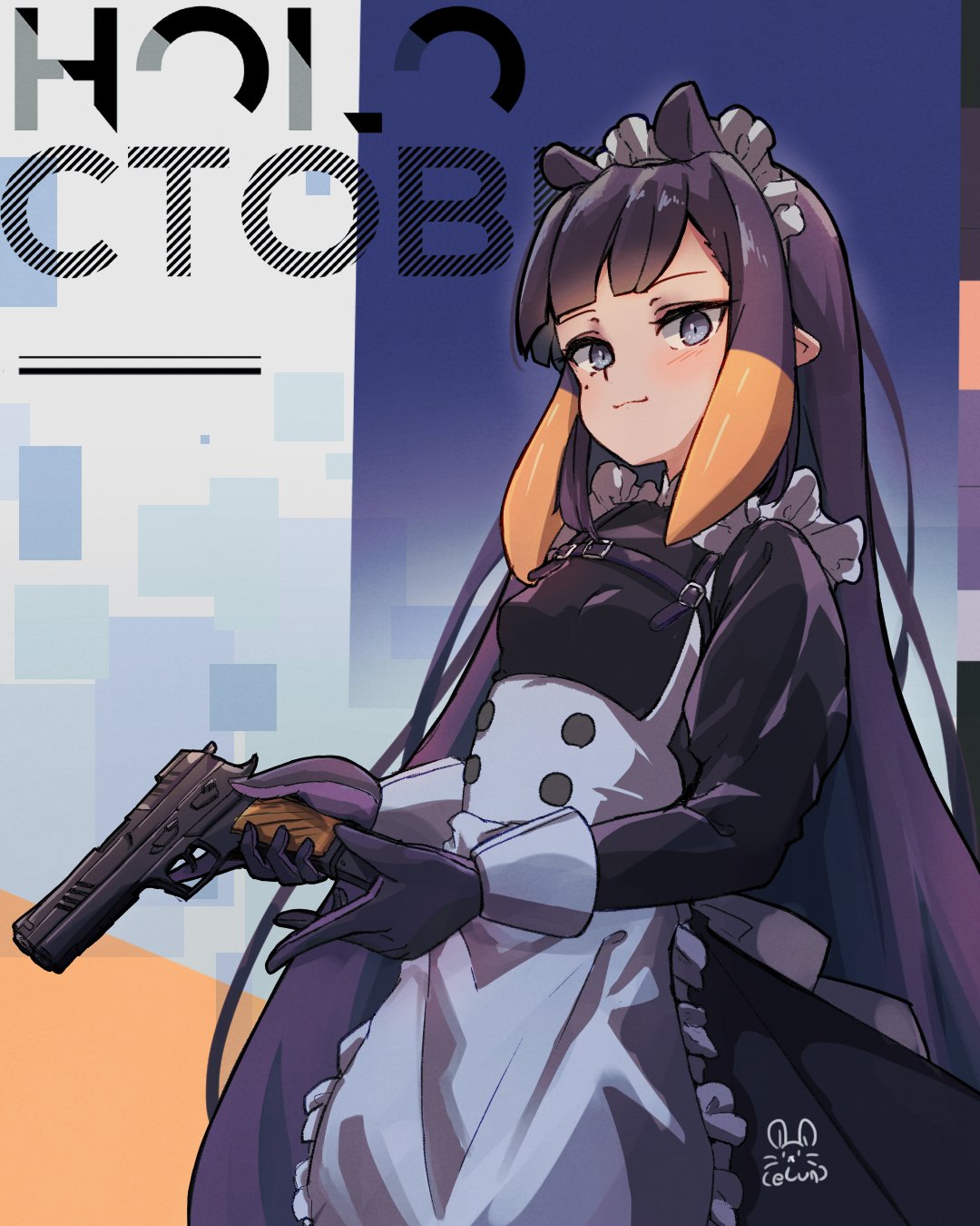 1girlalternate costumeapronbeltblack dressblack glovesblue eyesblunt bangsdressfrilled apronfrillsglovesgradient hairgunhandgunholdingholding gunholding weaponlong hairmaidmaid apronmaid headdressmolemole under eyemulticolored hairorange hairpointy earspuffy sleevespurple hairsolotentacle hairtentaclesunconventional maidvery long hairvirtual youtuberweaponwhite apronwrist cuffs