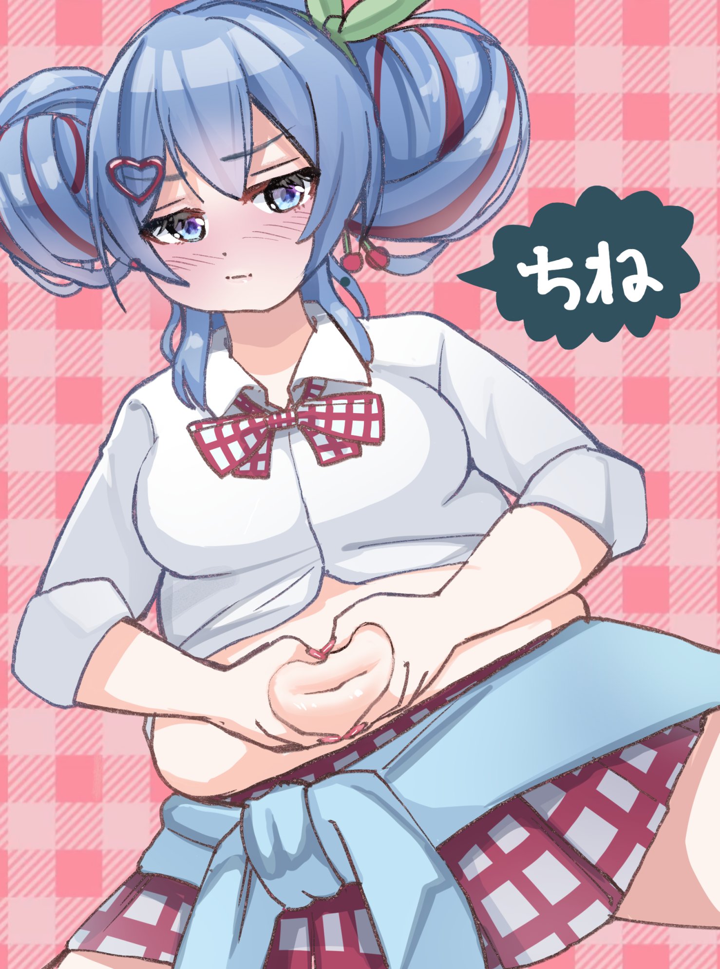 1girlbellyblue eyesblue hairblushbowbowtiecherry hair ornamentclothes around waistdouble bunembarrassedfood-themed hair ornamentgreen ribbonhair bunhair ornamenthair ribbonheartheart hair ornamentheart handsheart hands over stomachjapanese textmidriffmulticolored hairnavelpink backgroundplaid backgroundplaid bowplaid clothesplaid skirtplumpred hairred nailsred skirtribbonschool uniformshirtshirt around waistskirtsolostreaked hairtight clotheswhite shirt