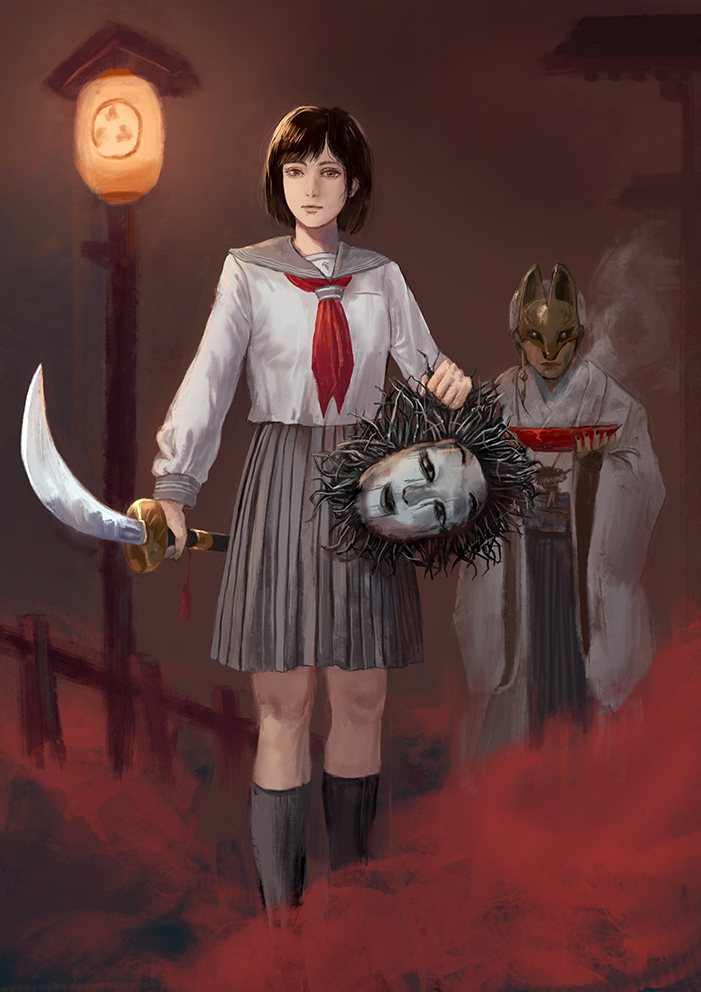 1boy1girlblack hairholding detached headjapanese clotheskimonolanternpaper lanternschool uniformsteamswordweaponwhite hair