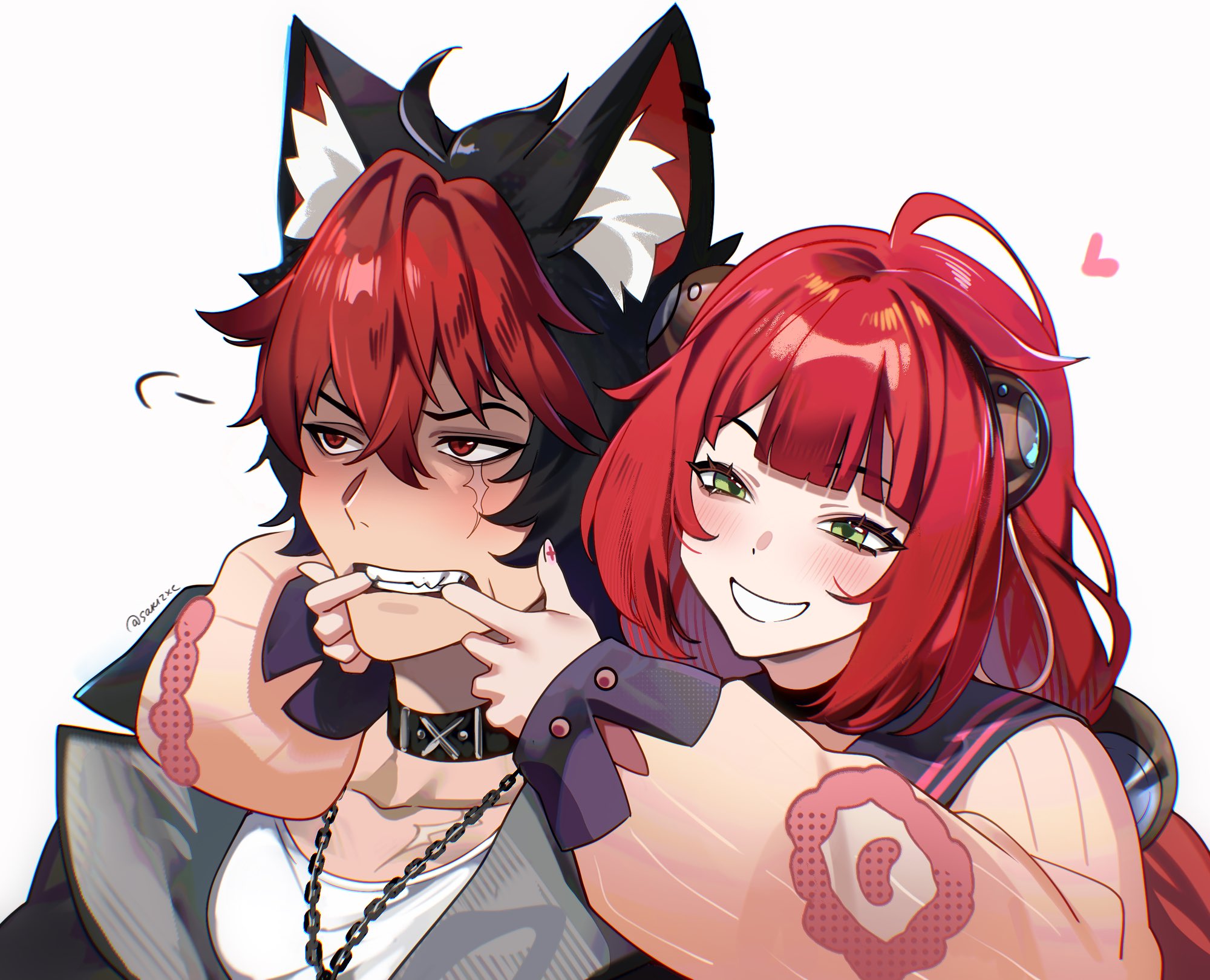 1boy1girlahogeanimal ear fluffblack chokerblack hairblack sailor collarblushchokercollarbonecolored bangsfingernailsgreen eyesgrinhair between eyeshearing aidheartlong hairlong sleeveslooking to the sidered eyesred hairsailor collarscarscar across eyescar on facesimple backgroundsmileteethtwitter usernamewhite background