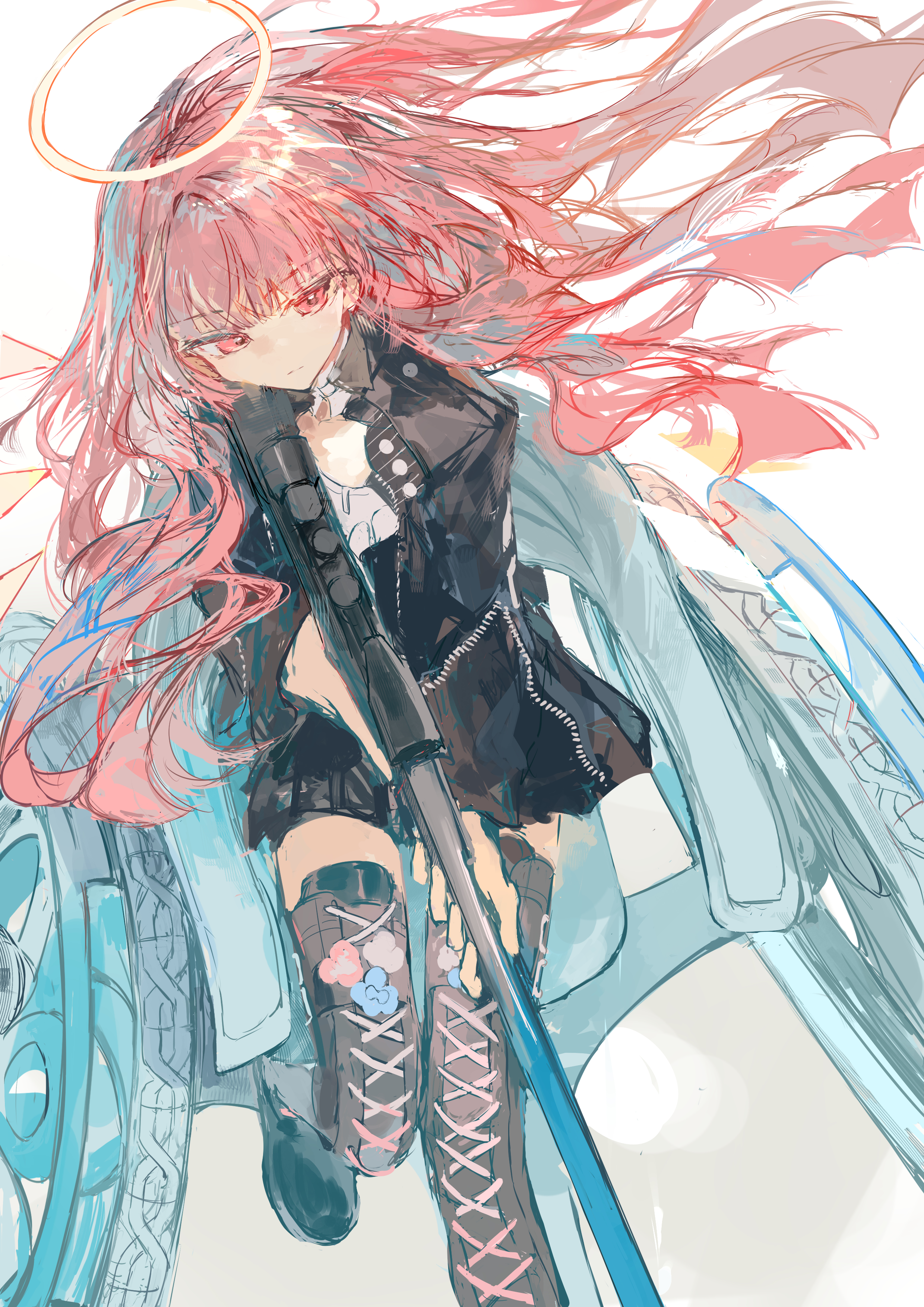 1girlblack dressblack jacketbootsdetached collardressfloating hairflowergunhaloholdingholding gunholding weaponjacketlace-up bootslong hairpink eyespink hairriflescopeshirtsittingsniper riflesolothigh bootstraditional haloweaponwheelchairwhite backgroundwhite shirt