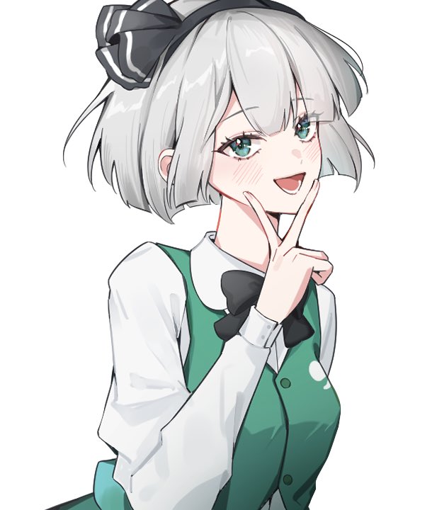 :d1girlblack bowblack bowtieblushbowbowtiecollared shirtgreen eyesgreen skirtgreen vesthairbandlong sleeveslower teeth onlymedium hairopen mouthshirtskirtsmilesoloteethupper bodyvv over mouthvestwhite hairwhite shirt