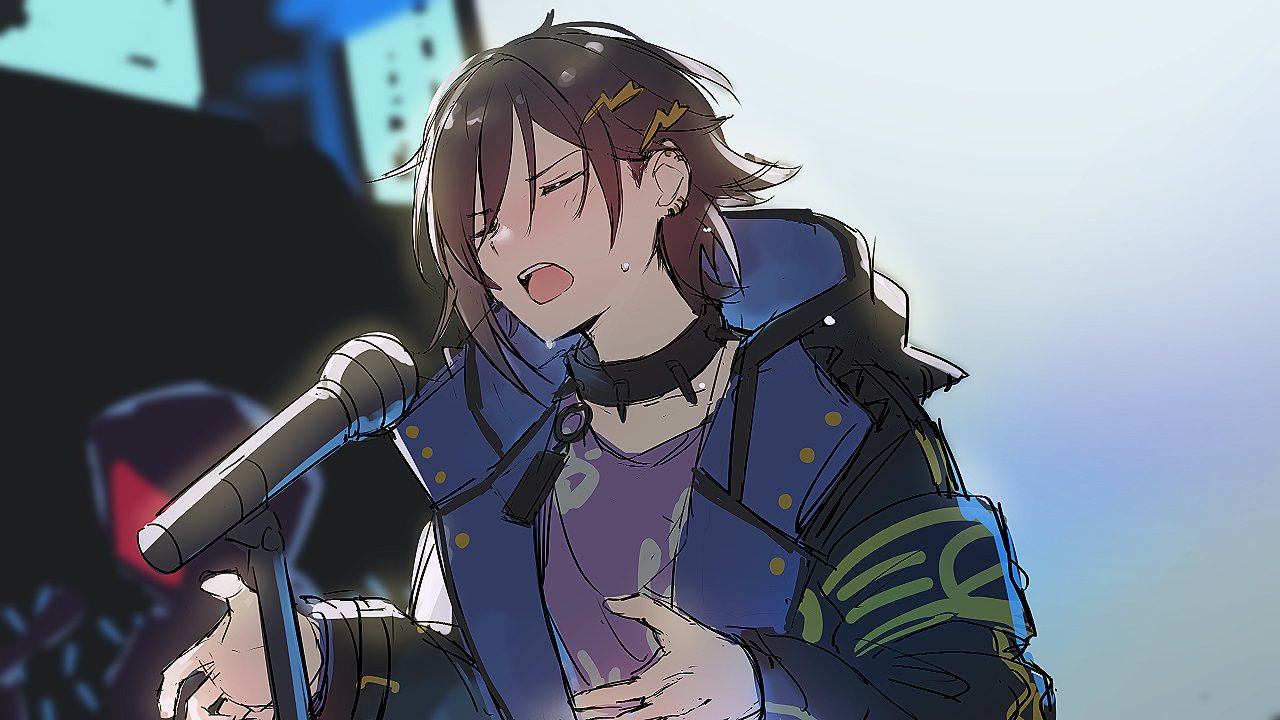 1boyarmbandaudienceblack armbandblack hairclosed eyescollarcollarbonecrew neckearringsfurrowed browhair between eyeshair ornamenthaircliphandprinthoodhood downjacketjewelrylightning boltlightning bolt hair ornamentlightning bolt symbollong sleevesmale focusmicrophonemicrophone standmusicopen clothesopen handsopen jacketopen mouthpurple shirtscreenshirtshort hairsingingsolospiked collarspikesstagesweattwo-sided fabrictwo-sided jacketupper bodyvirtual youtuber