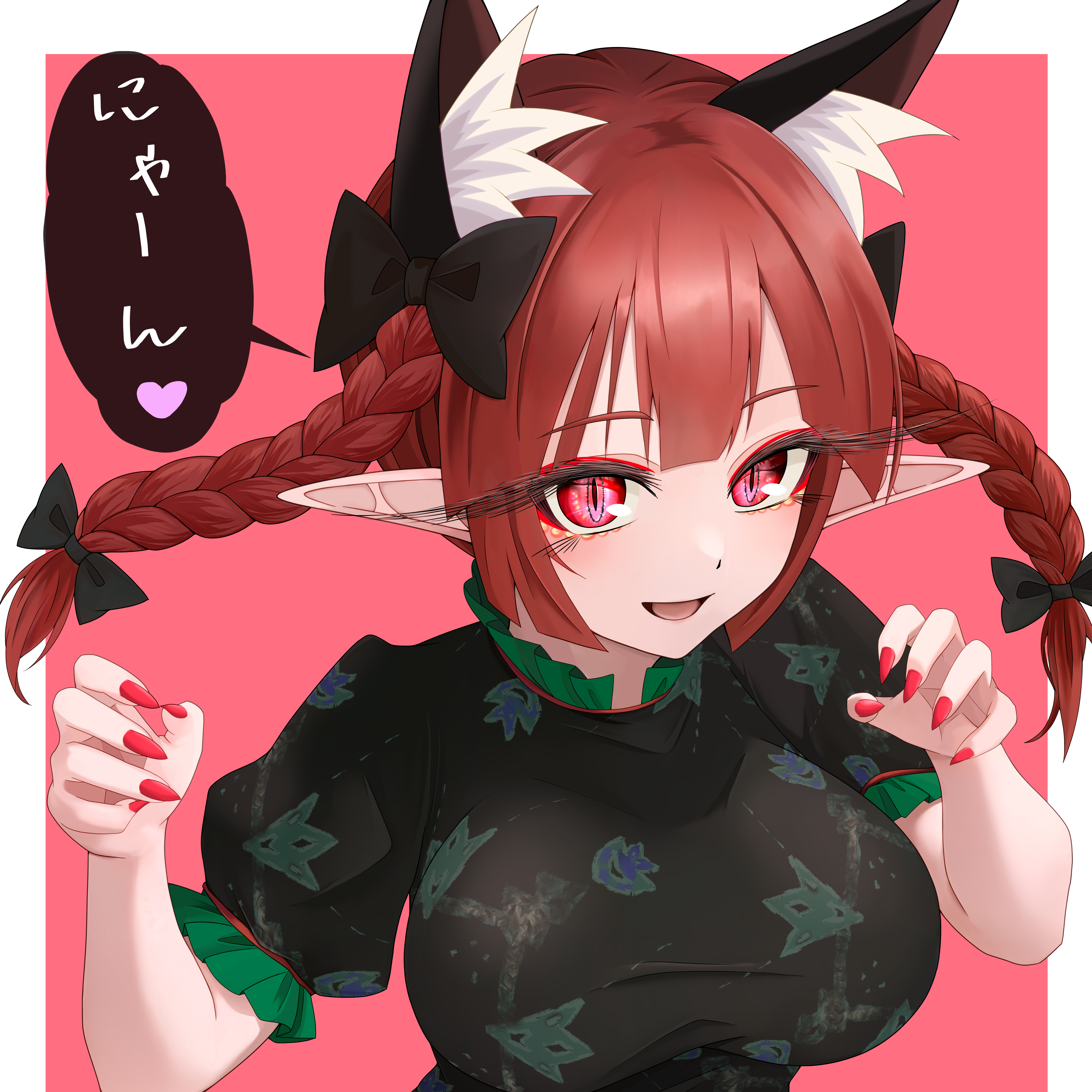 1girlanimal earsblack dressbraidbreastscat earscat girldressextra earsfingernailsfrilled sleevesfrillshair ribbonlarge breastslooking at viewermedium hairnail polishparted lipspaw posepointy earsred eyesred hairred nailsribbonsharp fingernailsshort sleevessmilesolospeech bubbletwin braids