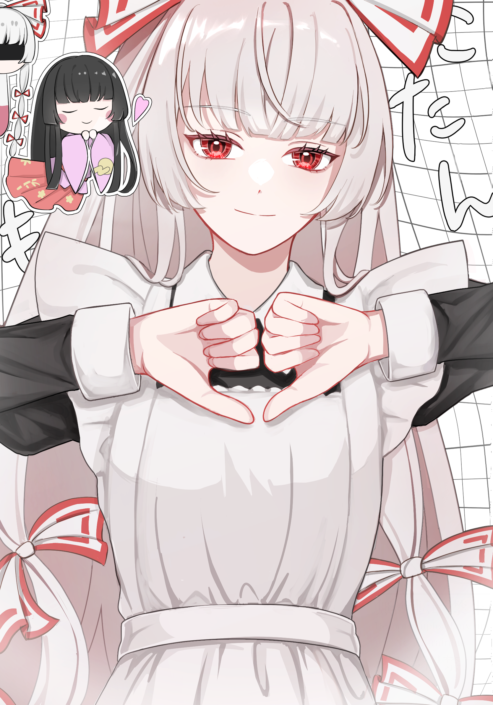 2girlsalternate costumeapronblack dressblack hairblunt bangsbowchibiclosed eyesclosed mouthdresshair bowhair ribbonheartheart handshime cutlong hairlong sleeveslooking at viewerluuu u umaidmaid apronmultiple girlspink shirtred eyesred skirtribbonshirtskirtsmilethumbs downthumbs down heart handsvery long hairwhite hair