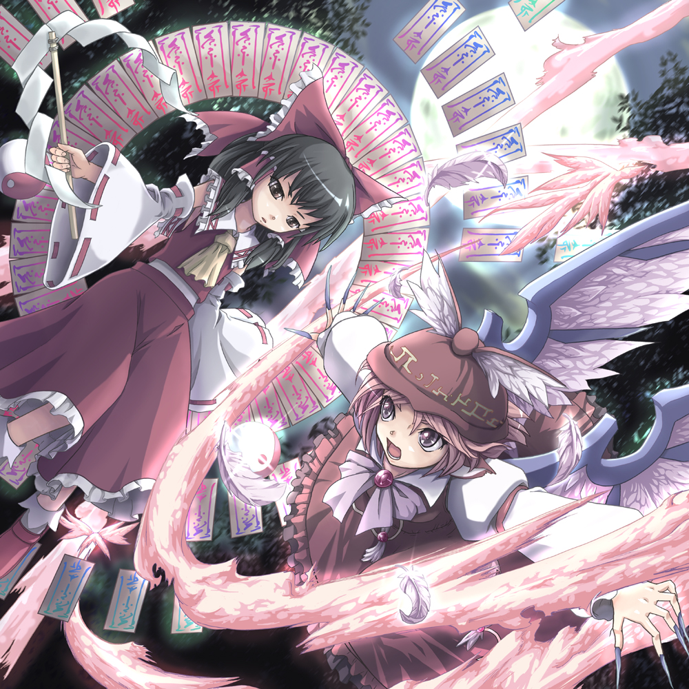 2girlsanimal earsbattleblack hairbowbrown eyesbrown hairclawsdanmakudetached sleevesfeathersfemale focusfingernailsfull moongoheihair bowhair tubeshatjapanese clotheslong fingernailsmikomoonmultiple girlsnail (hardware)ofudaskirtyin yang