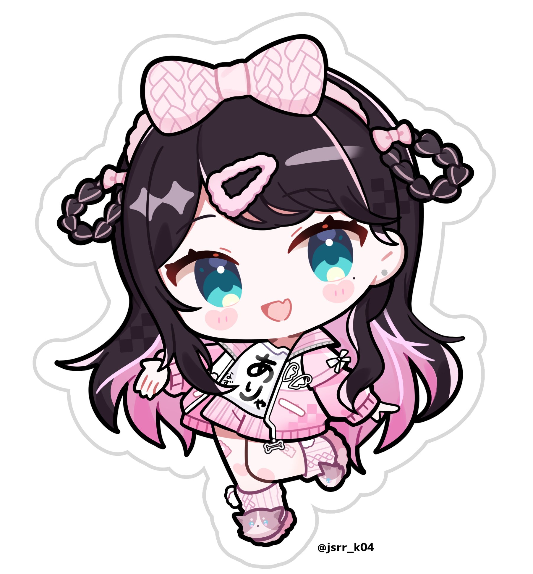 :d1girlbandaidbandaid on legblack hairblue eyesblush stickersbowbow hairbandbraidbraided hair ringschibichibi onlyfangfull bodyhair bowhair ornamenthair ringshairbandhaircliplong hairlooking at viewermolemole under eyemulticolored hairopen mouthoutlineparted bangspink bowpink hairpink hairbandpink shortspink slipperspink socksshortsskin fangslipperssmilesockssolostandingstanding on one legtwitter usernametwo-tone hairwhite background