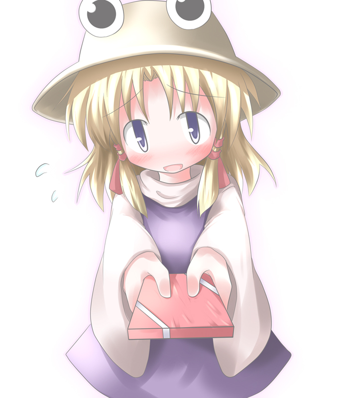 1girlblonde hairblushchildchocolatefemale focusgifthatincoming giftlooking at vieweropen mouthpurple eyessolosweatwhite background