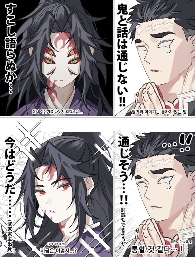 2boysbeadsblack haircolored scleracryingcrying with eyes openextra eyeshigh ponytailkorean textlong hairlooking at viewermale focusmultiple boysown hands togetherparted lipsponytailprayer beadsred eyesred sclerashort hairspiked hairtearsupper bodyvery long hairyellow eyes