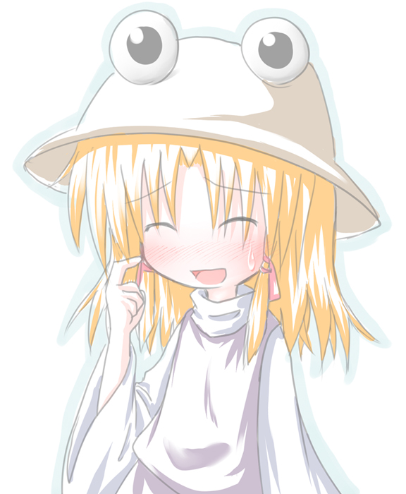 1girlblonde hairblushchildfemale focushatsimple backgroundsolostandingupper bodywhite background