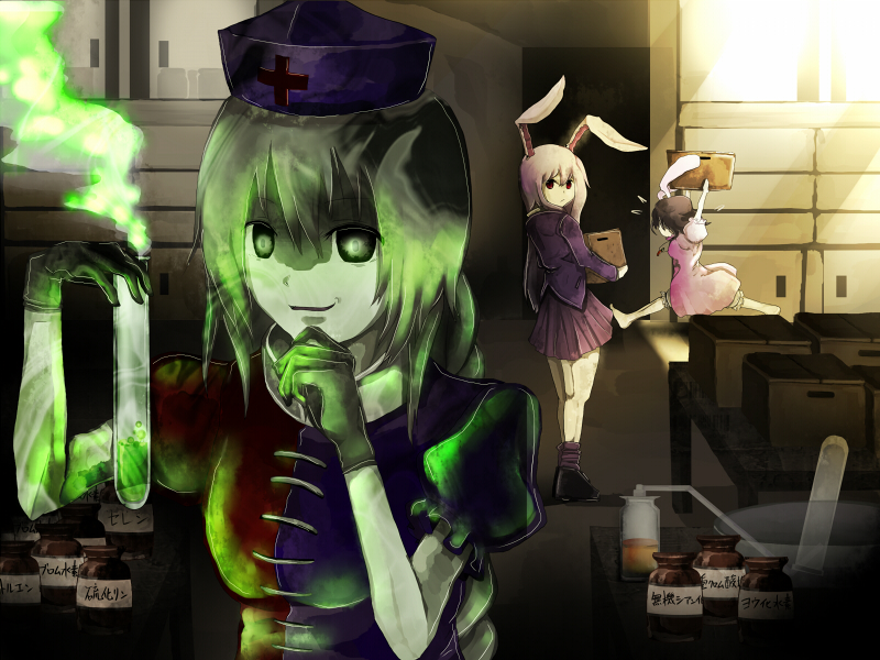 3girlsalchemyanimal earsblack hairbookfemale focusglowingindoorsmultiple girlspotionrabbit earsskirtupper body