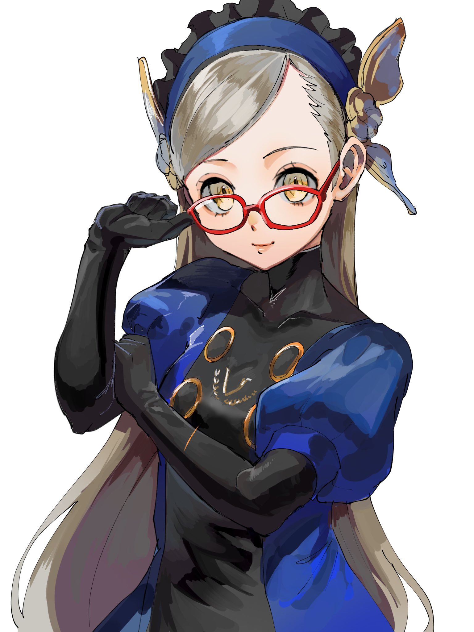 1girladjusting eyewearbespectacledblack glovesblonde hairblue dressblue hairbandbutterfly hair ornamentclosed mouthdresselbow glovesfinger on eyewearflower hairbandglassesgloveshair ornamenthairbandhand on own armlong hairlooking at viewerpuffy sleevesred-framed eyewearsimple backgroundsmilesoloturtleneckturtleneck dresstwo-tone dressupper bodywhite backgroundyellow eyes