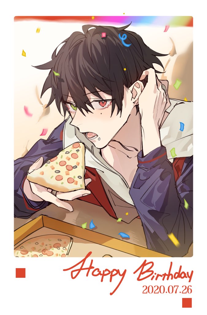 1boyblack hairblue jacketbordercollarboneconfettidatedear piercingearringseatingenglish textfoodfood on facegreen eyeshair behind earhair between eyeshappy birthdayheterochromiaholdingholding foodholding pizzahoodhood downhoodiejacketjewelrylong sleeveslooking at viewermale focusmolemole under eyemole under mouthmulticolored jacketopen clothesopen mouthpiercingpizzapizza slicered eyesred jacketshort hairsolotableupper bodywhite hoodie