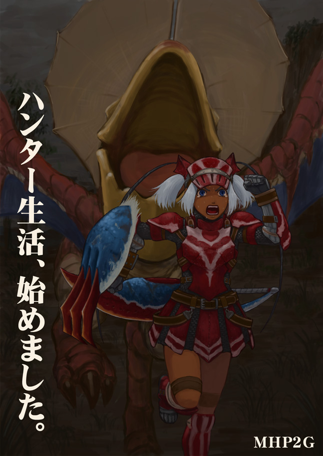 1girlanimal earsarmorbeltblue eyescat earschasingdark skindark-skinned femalefleeinggloveshathermitaur (armor)miniskirtmonsteropen mouthrunningsheathsheathedshieldshort hairshort twintailsshoutingskirtswordtearstext focusthigh straptwintailsweaponwhite hair