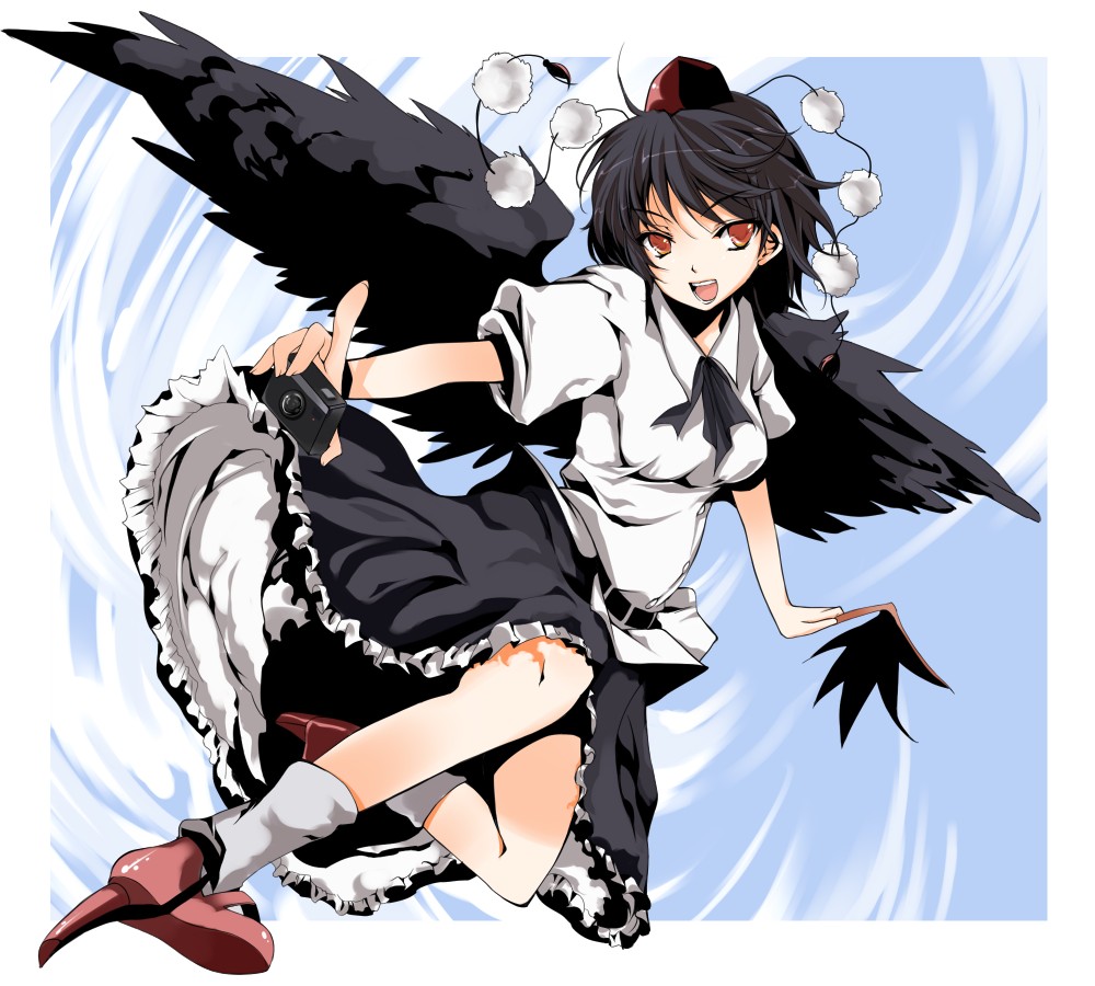 1girlblack hairblack wingscameradayfemale focusgetahand fanhatlooking at vieweropen mouthred eyesskysolotengu-getatokin hatwings