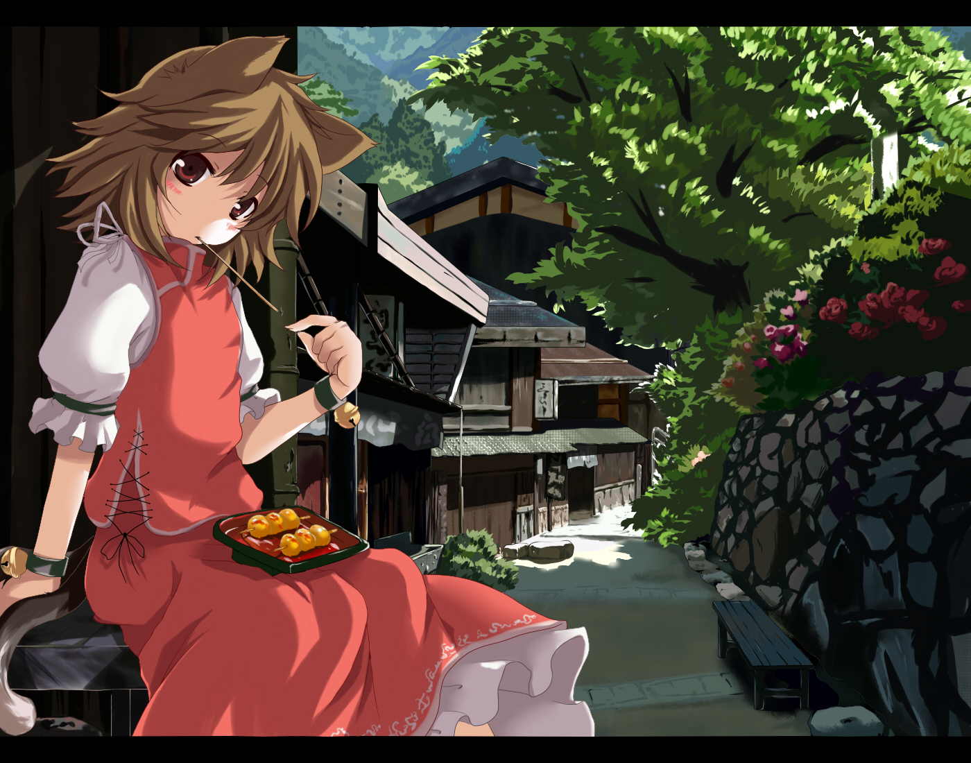 1girlanimal earsbrown haircat earscat girlcat taildangofemale focusflowerfoodletterboxedmitarashi dangonatureoutdoorsplantsceneryshort hairskirtsolotailwagashi