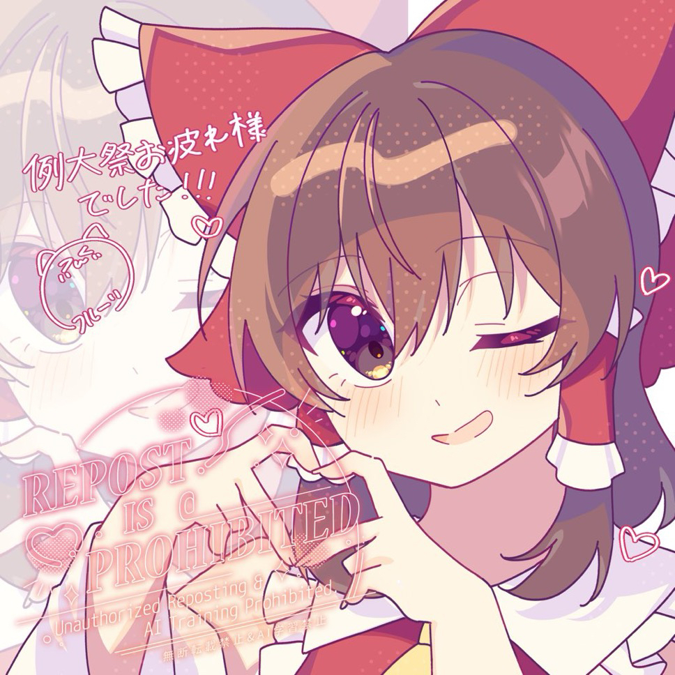 1girlascotblushbowbrown eyesbrown hairdetached sleevesfour-finger heart handsfrilled bowfrilled hair tubesfrillshair bowhair tubesheartheart handslong hairlooking at viewerone eye closedopen mouthred bowsmilesolowatermarkyellow ascotzoom layer