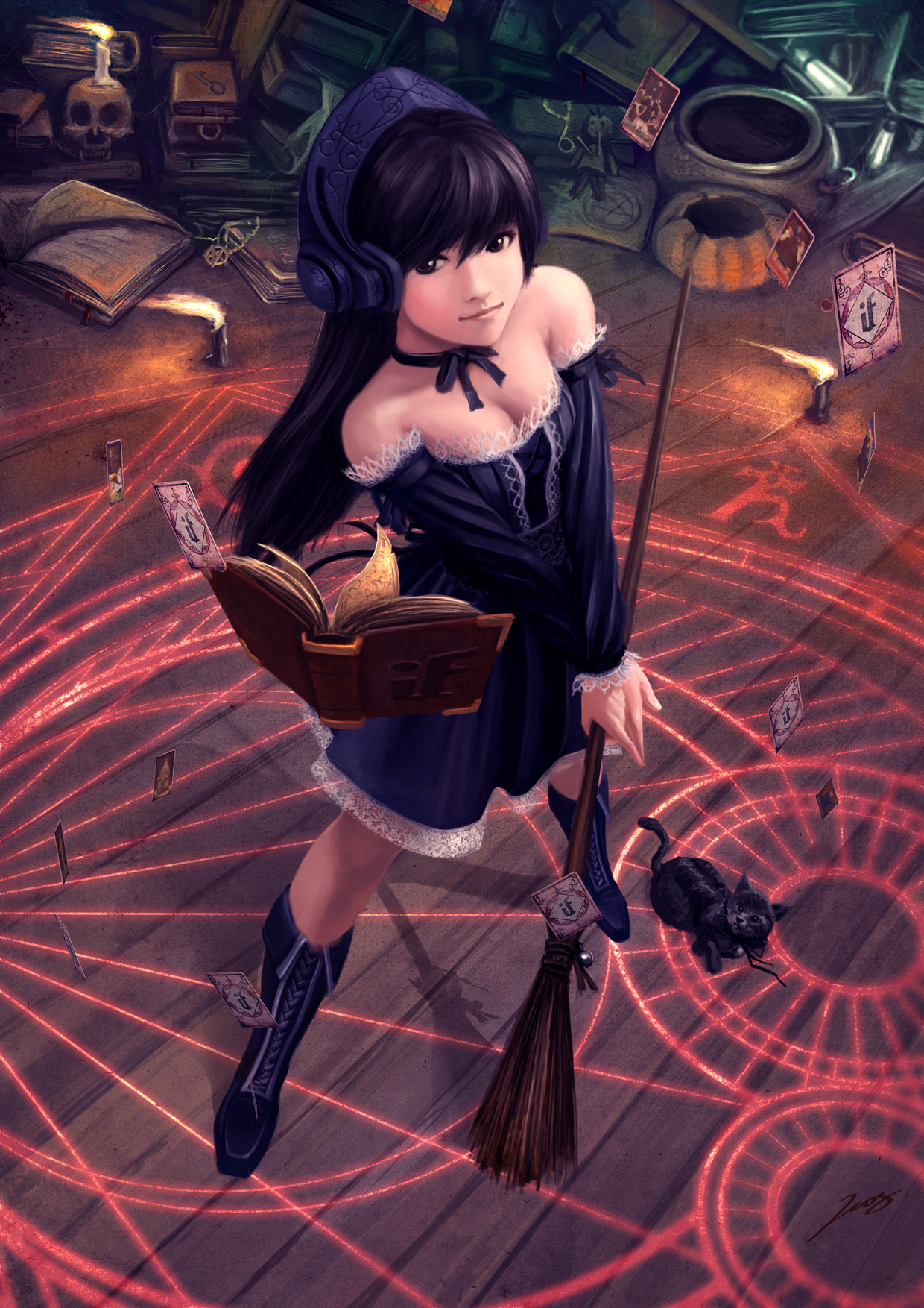 1girlblack hairbookbroombrown eyescandlecardcatfemale focusfloating cardglovesgothic lolitaheadbandlolita fashionmagic circleribbonskullsolostandingstanding on magic circle