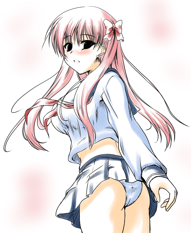 00s1girlassblushbowfemale focushair bowlong hairlooking backpantiespink hairschool uniformserafukuskirtsolounderwearwhite panties