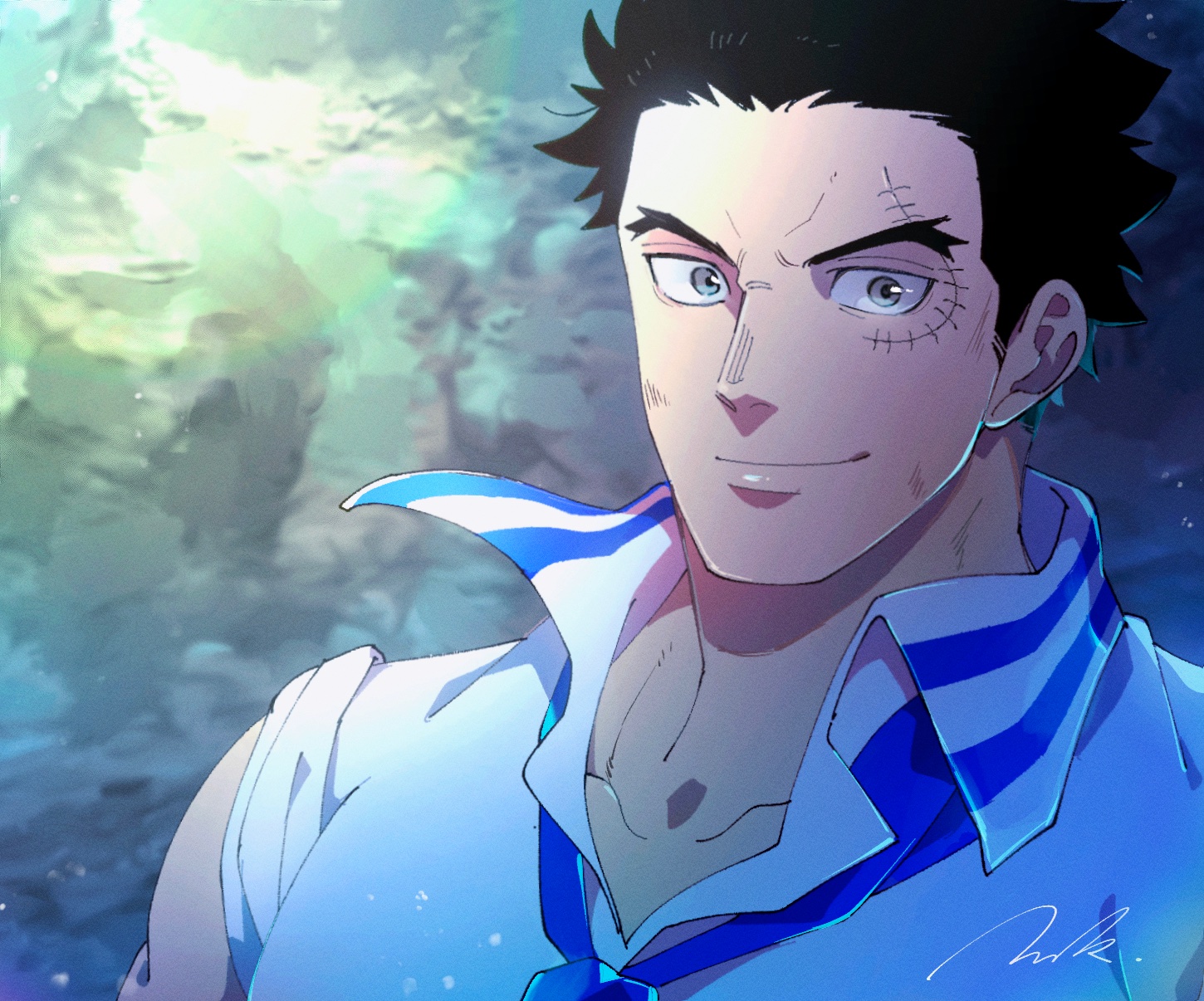 1boyaged downblack hairblue neckerchiefcollared shirtlooking at viewermale focusneckerchiefscarscar on faceshirtshort hairsignaturesleevelesssmilesolo