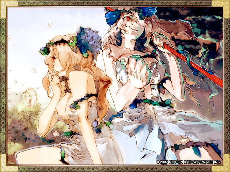 etna (disgaea), disgaea, makai senki disgaea, 00s, 1girl, black gloves, black thighhighs, boots, bracelet, breasts, choker, cleavage, demon, earrings, elbow gloves, female focus, full body, gloves, gradient background, head tilt, jewelry, looking at viewer, multiple girls, navel, outdoors, pointy ears, red eyes, red hair, simple background, sitting, small breasts, smile, solo, stomach, tail, thighhighs, twintails, white background, white boots, wings, yokozuwari