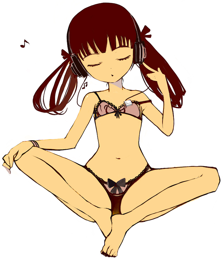 1girlbarefootbradigital media playerfeetfemale focusflat chestheadphonesipodlingeriemusical notepantiessolounderwearunderwear only