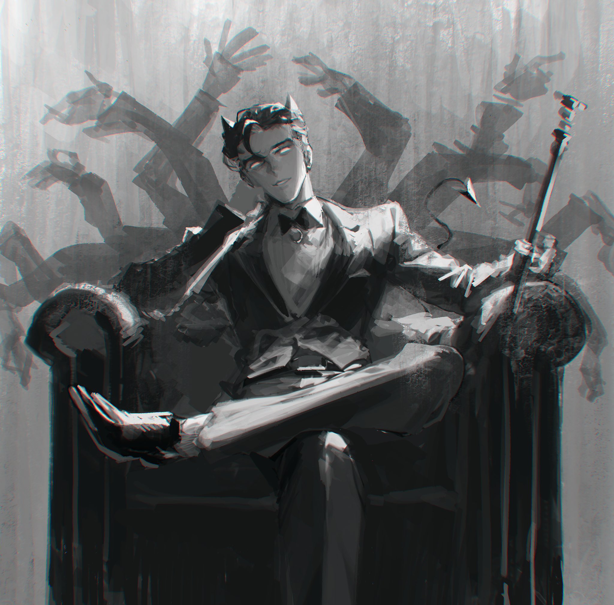 1boyarmchairbowbowtiechaircrossed legsdemon boydemon hornsdemon tailextra armsgrey backgroundgreyscaleholdinghornsjacketlong sleeveslooking at viewermale focusmonochromepantsparted lipsshoesshort hairsittingsolid eyessolotailwhite eyes