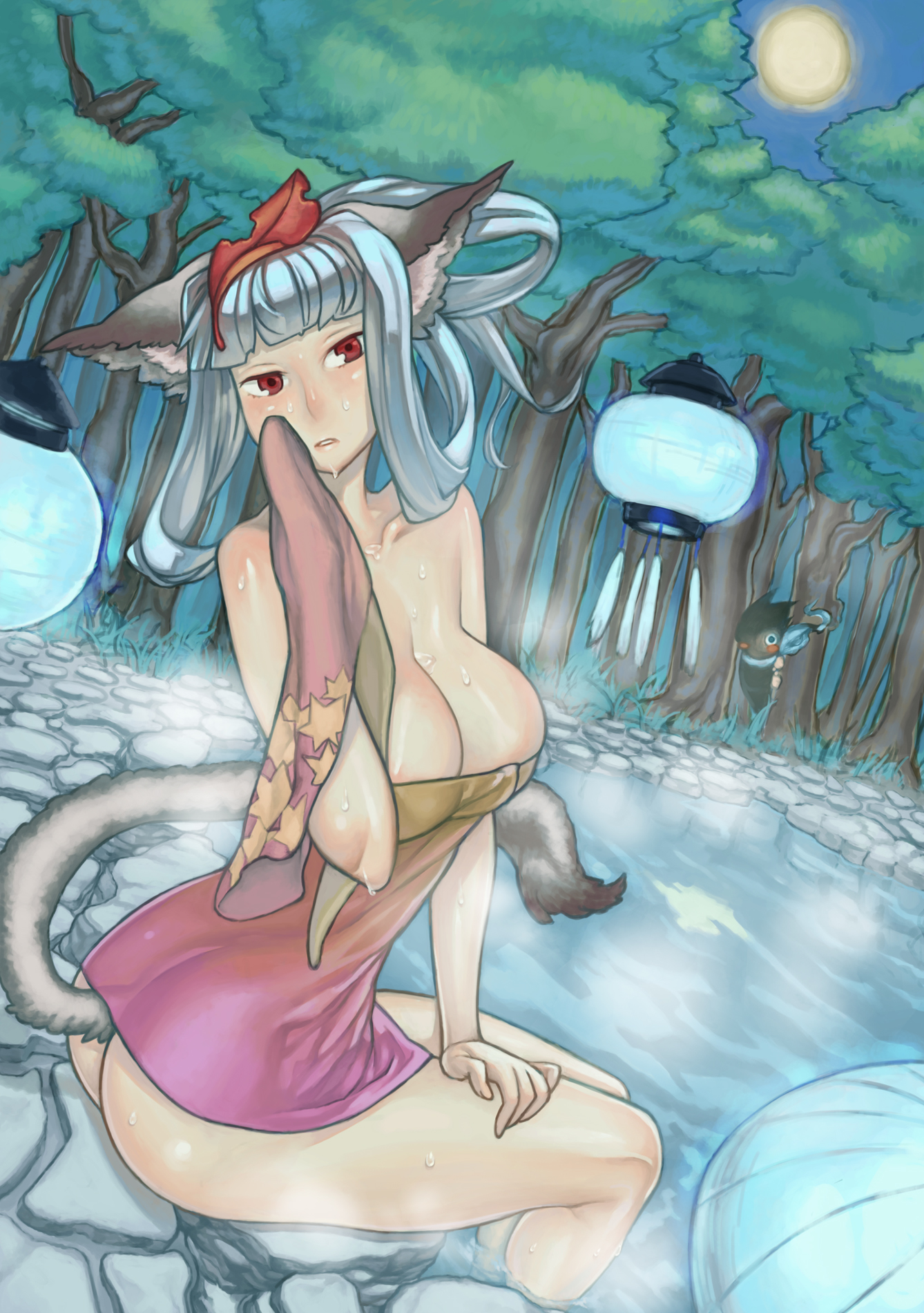 saeki hokuto, galge.com, 00s, 1girl, 2009, 3:, arms up, bdsm, black hair, blush, bondage, bound, bound wrists, breasts, camellia, censored, convenient censoring, covered erect nipples, dutch angle, facial mark, female focus, flower, forehead mark, hair in own mouth, hair ribbon, hakama, hakama skirt, japanese clothes, leg up, legs, long hair, long legs, lying, magatama, medium breasts, miko, nipples, no panties, on back, petals, ponytail, purple eyes, red hakama, ribbon, sarashi, skirt, socks, solo, sweat, thighs