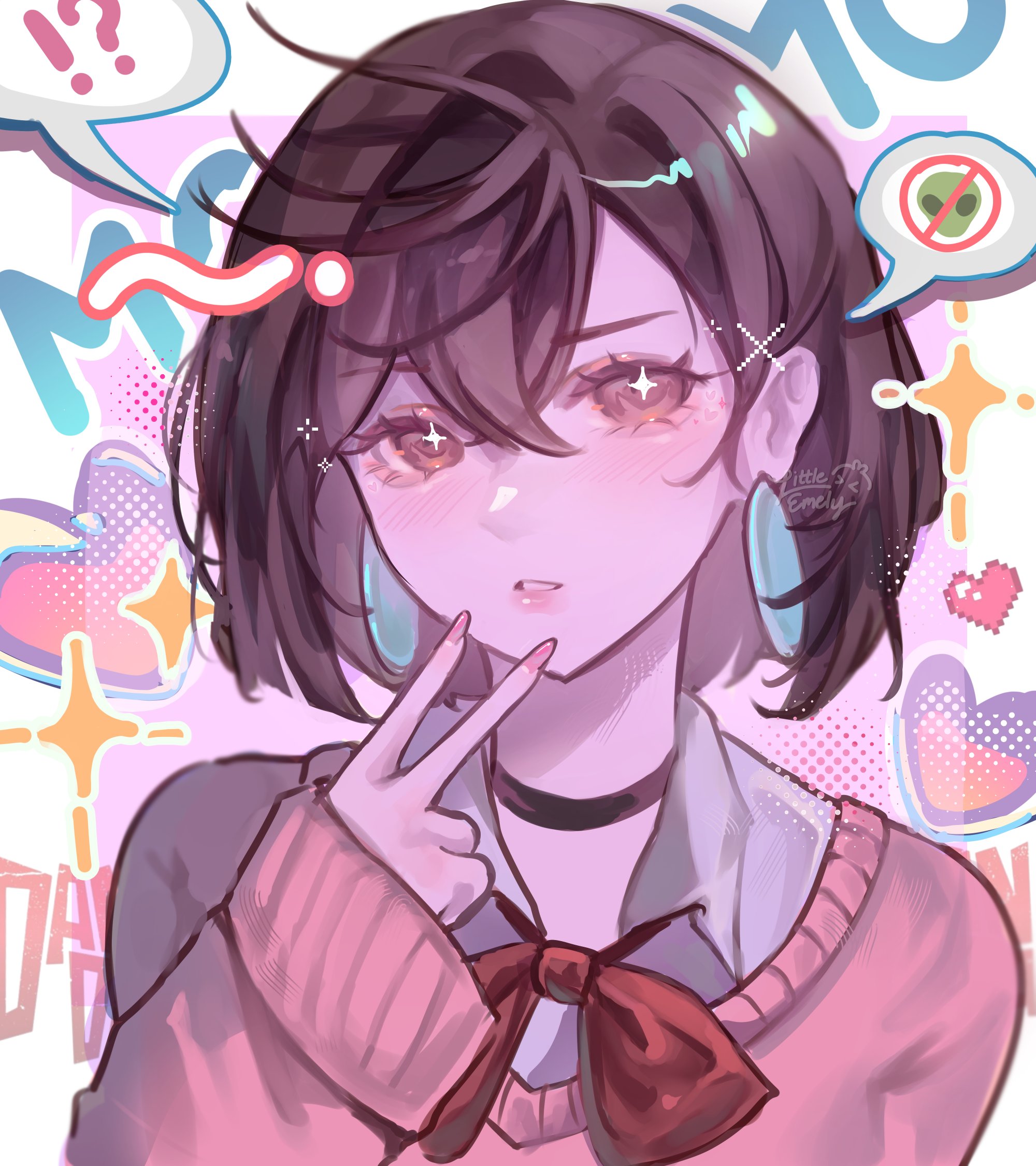 1boy1girlblack chokerblushbowbowtiebrown eyesbrown hairchokercollared shirtcrossed bangsearringshair behind earhair between eyesheartjewelrykami high school uniformlittleemelylong sleeveslooking at viewerloose bowtieparted lipspink lipspink nailspink sweaterpixel heartred bowred bowtieschool uniformshirtshirt under sweatershort hairsleeves past wristssolosparklesparkling eyesspoken interrobangstraight-onsweaterupper bodyvwhite shirt
