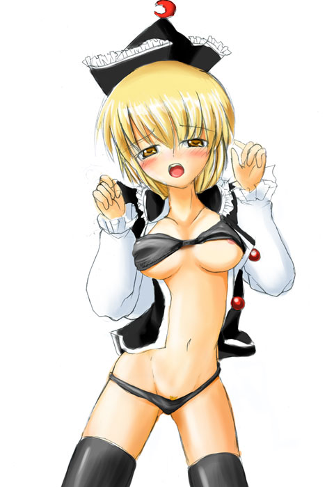 1girlblonde hairblushbrabreastsfemale focushatlingerieopen clothesopen shirtpantiesshirtshort hairsolounderwearwhite background