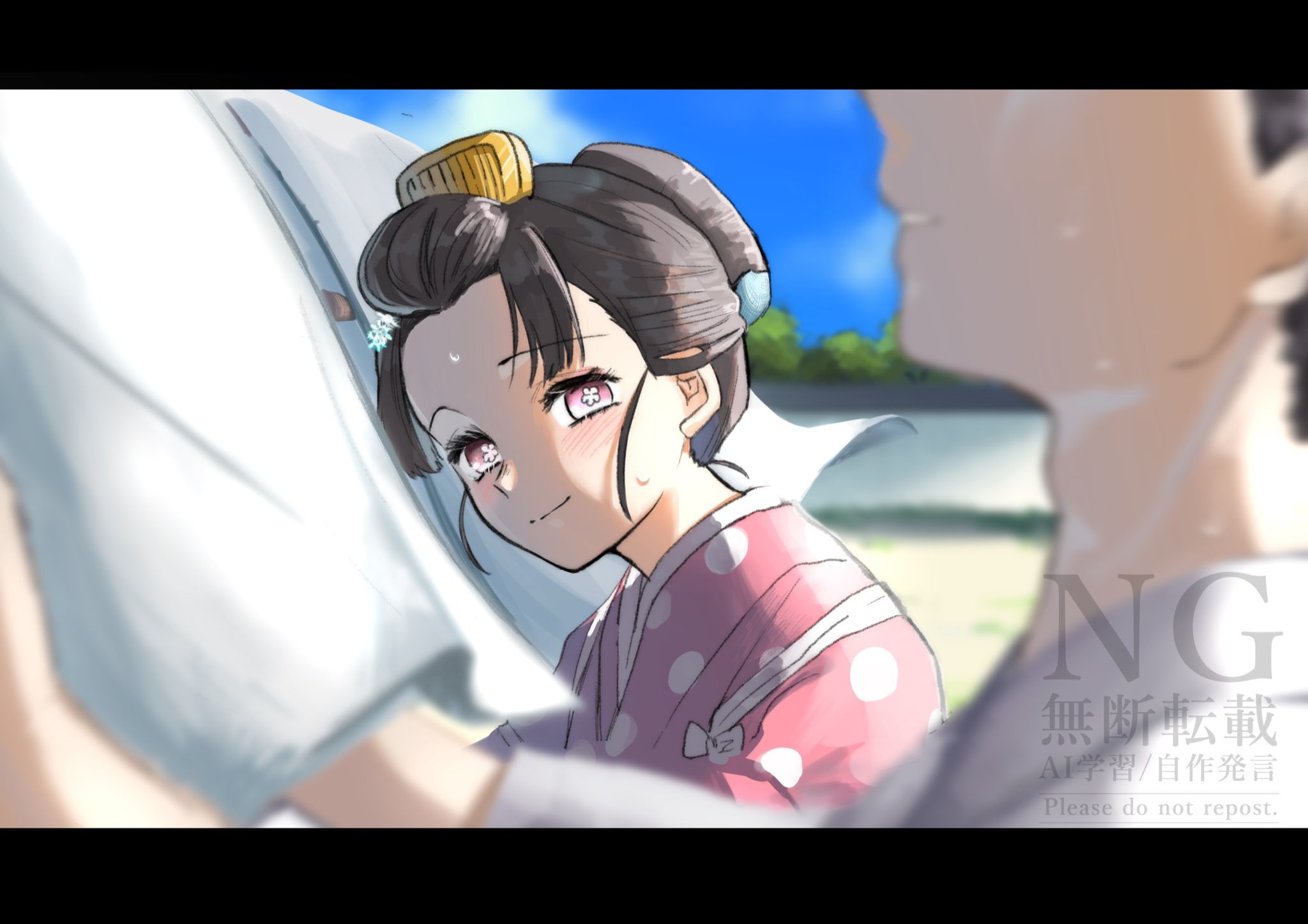 1boy1girlblack borderblack hairblushborderclosed mouthcombflowerflower-shaped pupilshair flowerhair ornamenthanging from clotheslinejapanese clotheskimonolaundrylooking at anothernatsuno maeparted bangsparted lipspink eyespink kimonopolka dotpolka dot kimonorobeshort hairsidelockssmilesweatsymbol-shaped pupilsupdowhite robe
