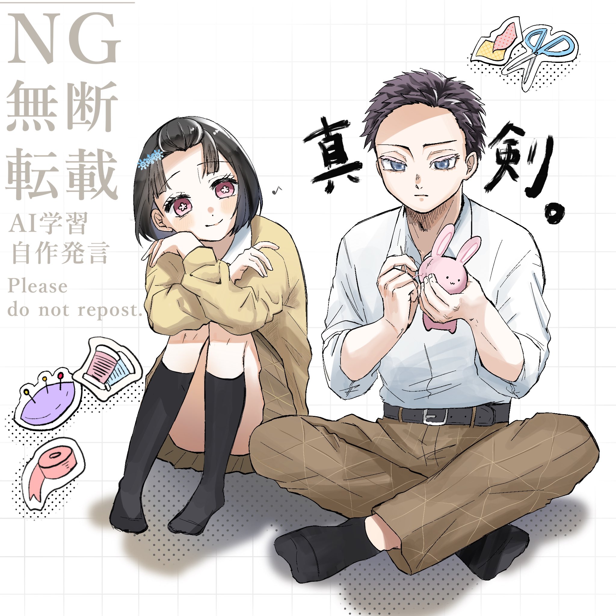 1boy1girlbeltblack beltblack hairblack socksblue eyesbrown pantsbrown skirtclosed mouthcollared shirtcrossed armsflower-shaped pupilsfull bodygrid backgroundholdingholding sewing needleholding stuffed toyhugging own legsmusical notenatsuno maepantsparted bangspink eyesschool uniformscissorssewingshirtshirt under sweatershort hairsittingskirtsmilesocksstuffed animalstuffed rabbitstuffed toysweatersymbol-shaped pupilstape measurethreadwhite shirtyellow sweater