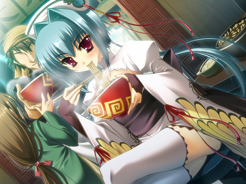 00s1boy2girlsblue hairchopstickscrossed legsdutch angleeatingfoodmeandrosmultiple girlsno eyesnoodlesramenred eyessittingsolo focussteamthighhighs