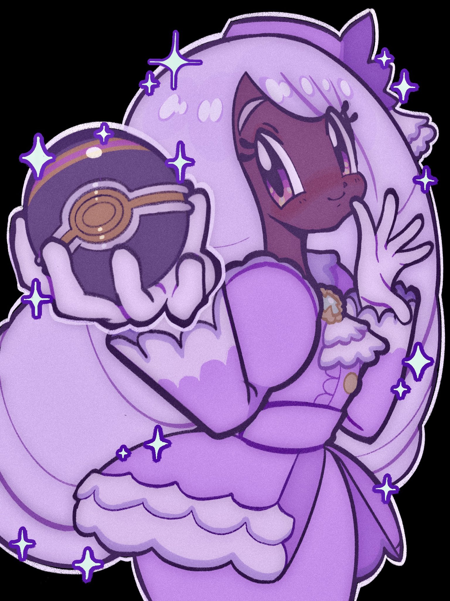 1girlascotdark skindark-skinned femaledressfascinatorfrilled ascotfrillsgloveshands upholdingholding poke balljuliet sleeveskiddo saltylong hairlong sleeveslooking at viewerlow drillsluxury balloutlineoutstretched handpoke ballpuffy sleevespurple dresspurple eyespurple glovespurple hairsmilesolosparklevery dark skinwhite outline