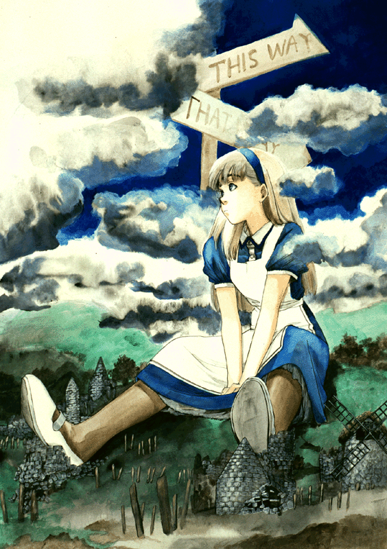 1girlapronblonde hairclouddressfemale focusforkroadgiantgiantesshairbandlingerielong hairmary janespetticoatshoessignskysolounderwearwindmill