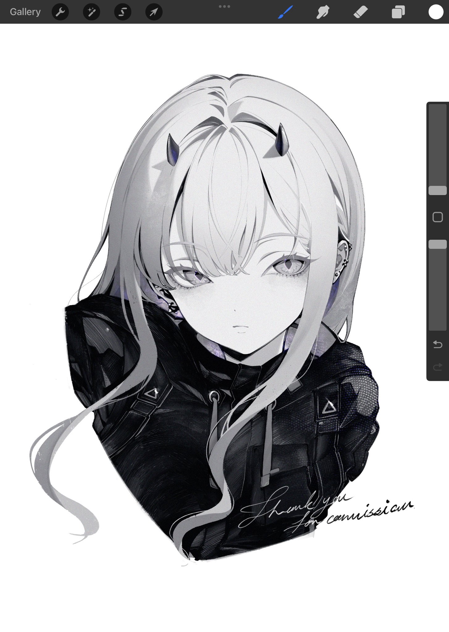 1girlart program in frameclosed mouthcropped shouldersdiamond (shape)diamond-shaped pupilsdouble-parted bangsear piercingearringsgreyscalejewelrylong hairlooking at viewermonochromepiercingsimple backgroundsingle earringsmall hornssolosymbol-shaped pupilswhite background