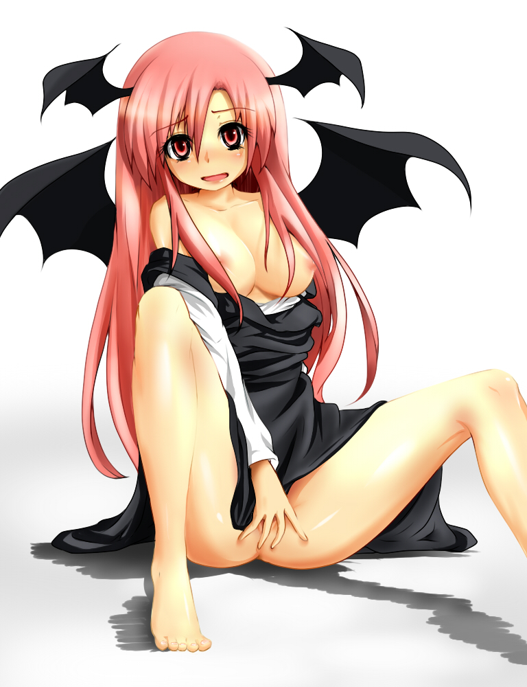 1girlbarefootbat wingsbottomlessbreastscovering crotchcovering privatesembarrassedfeetfemale focushead wingslegslong hairnipplesno brano pantiespussyred eyesred hairsittingsolospread legsuncensoredwings