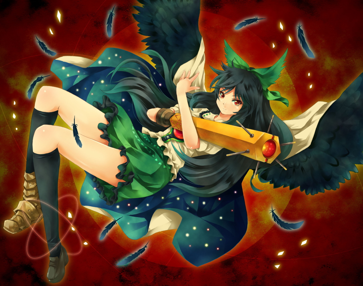 1girlasymmetrical clothesasymmetrical footwearblack hairfemale focushair ribbonmismatched footwearred eyesribbonsolowings