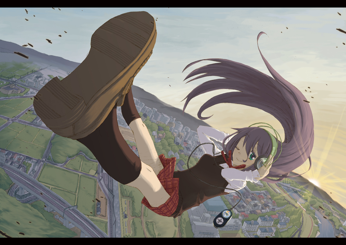fallingflyingfrom abovegreen eyesheadphoneskneehighsletterboxedlong hairone eye closedpurple hairribbonsceneryschool uniformsockssolowink