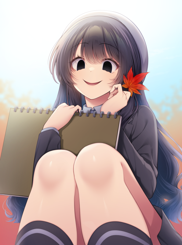 1girlbare legsberetblack eyesblack hairblack jacketblack skirtblack socksempty eyeshatholdingholding sketchbookjacketkneesleaflong hairlong sleeveslooking at viewermaple leafparted lipssittingsketchbookskirtsmilesockssolowhite hat