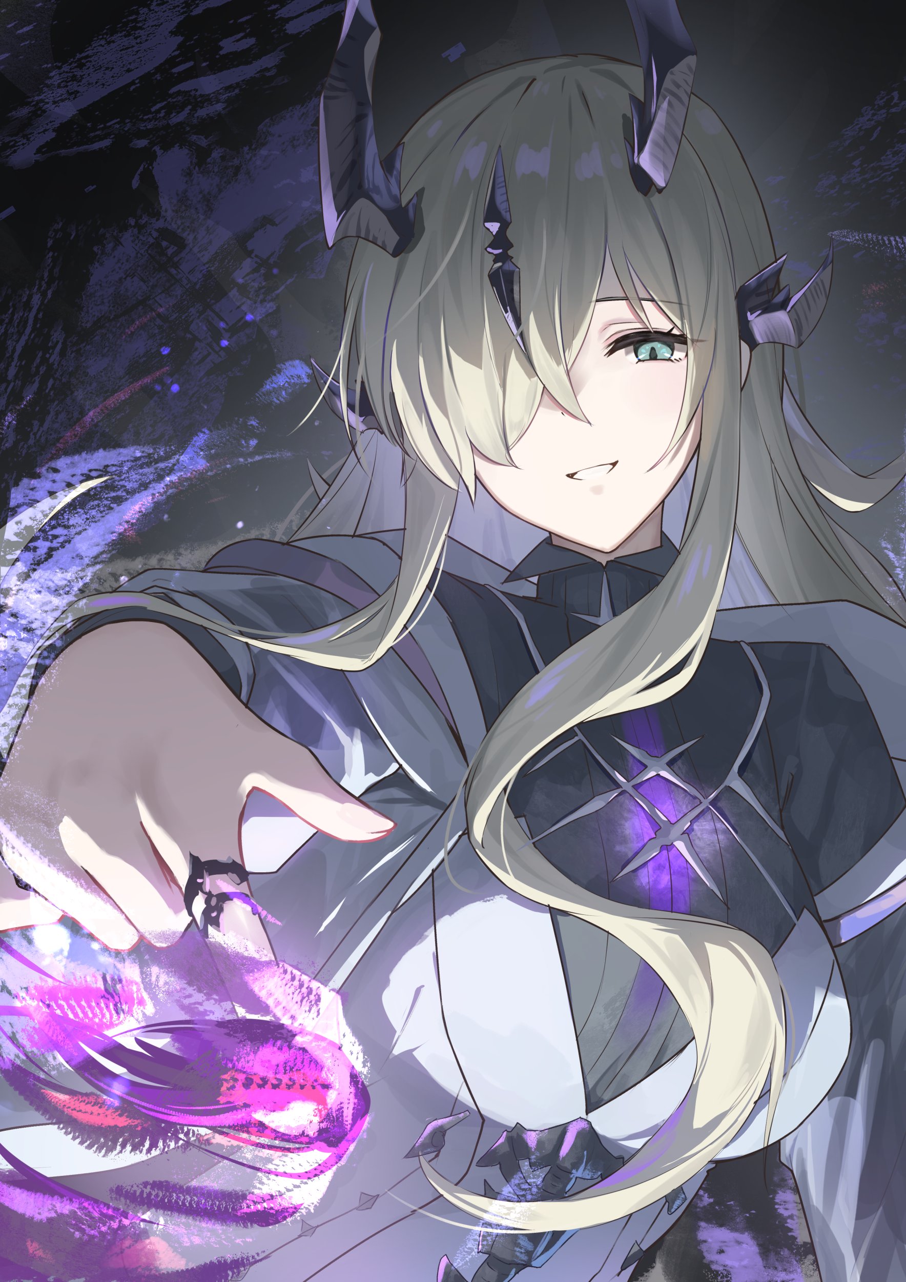 ibuki suika, touhou, jpeg artifacts, lowres, 1girl, :3, chibi, female focus, headpat, horn ornament, horn ribbon, horns, mini person, minigirl, monochrome, purple theme, ribbon, solo focus