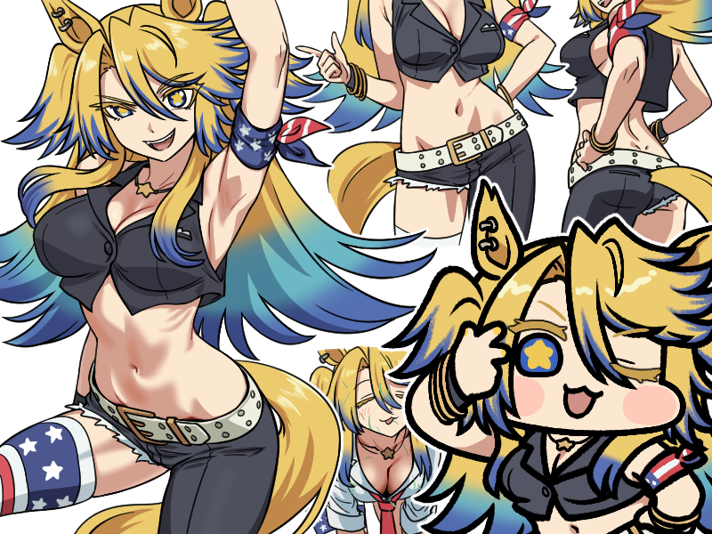 1girlamerican flagamerican flag legwearamerican flag printanimal earsarm uparmbandarmpitsasymmetrical legwearasymmetrical pantsbeltblack pantsblack shirtblonde hairblue eyesblue hairblushblush stickersbraceletbreastschibicleavageear ornamentflag printhorse earshorse girlhorse tailjewelrylarge breastslong hairlooking at viewermidriffmulticolored hairnavelnecklacenecktieone eye closedopen mouthpantsred necktieshirtsingle thighhighsleevelesssleeveless shirtsmilestar (symbol)star necklacestar-shaped pupilsstomachsymbol-shaped pupilstailteeththighhighsuneven legwearupper teeth onlywhite beltwhite shirt