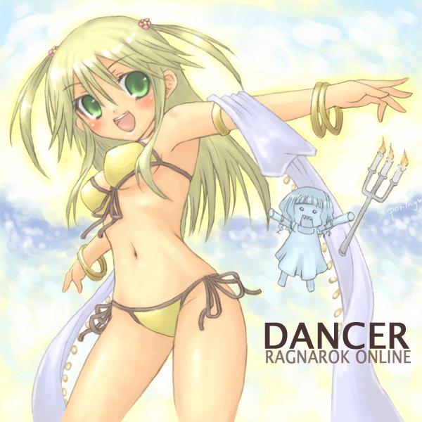 2girlsbikiniblonde haircandledancerdollgreen eyesjewelrylong hairlots of jewelrymultiple girlsshawlswimsuittwintails