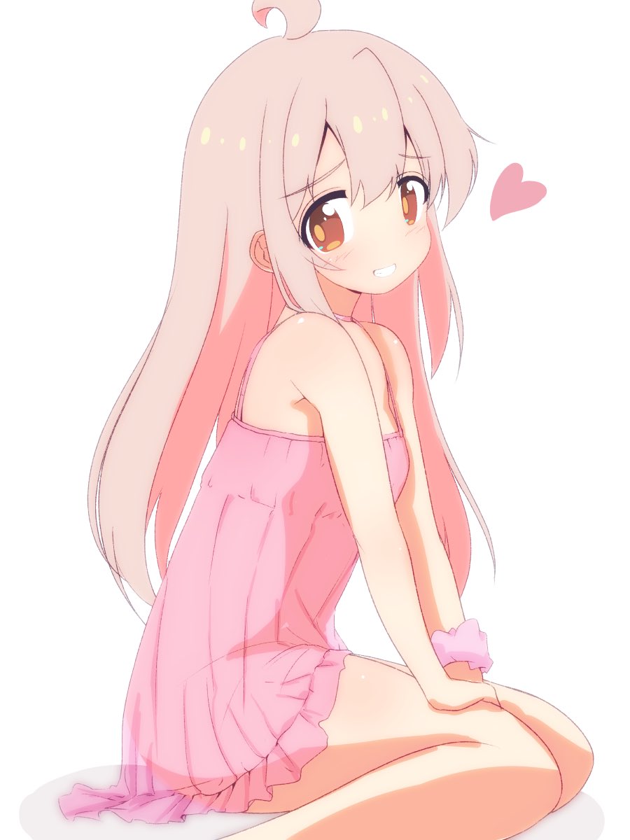 1girlahogebabydollbare armsbare legsbare shouldersbreastsbrown eyesfrillsfrom sidegrinhair between eyeshands on own kneesheartlong hairpink babydollpink hairpink scrunchiescrunchiesimple backgroundsittingsmall breastssmilesolowarizawhite backgroundwrist scrunchie