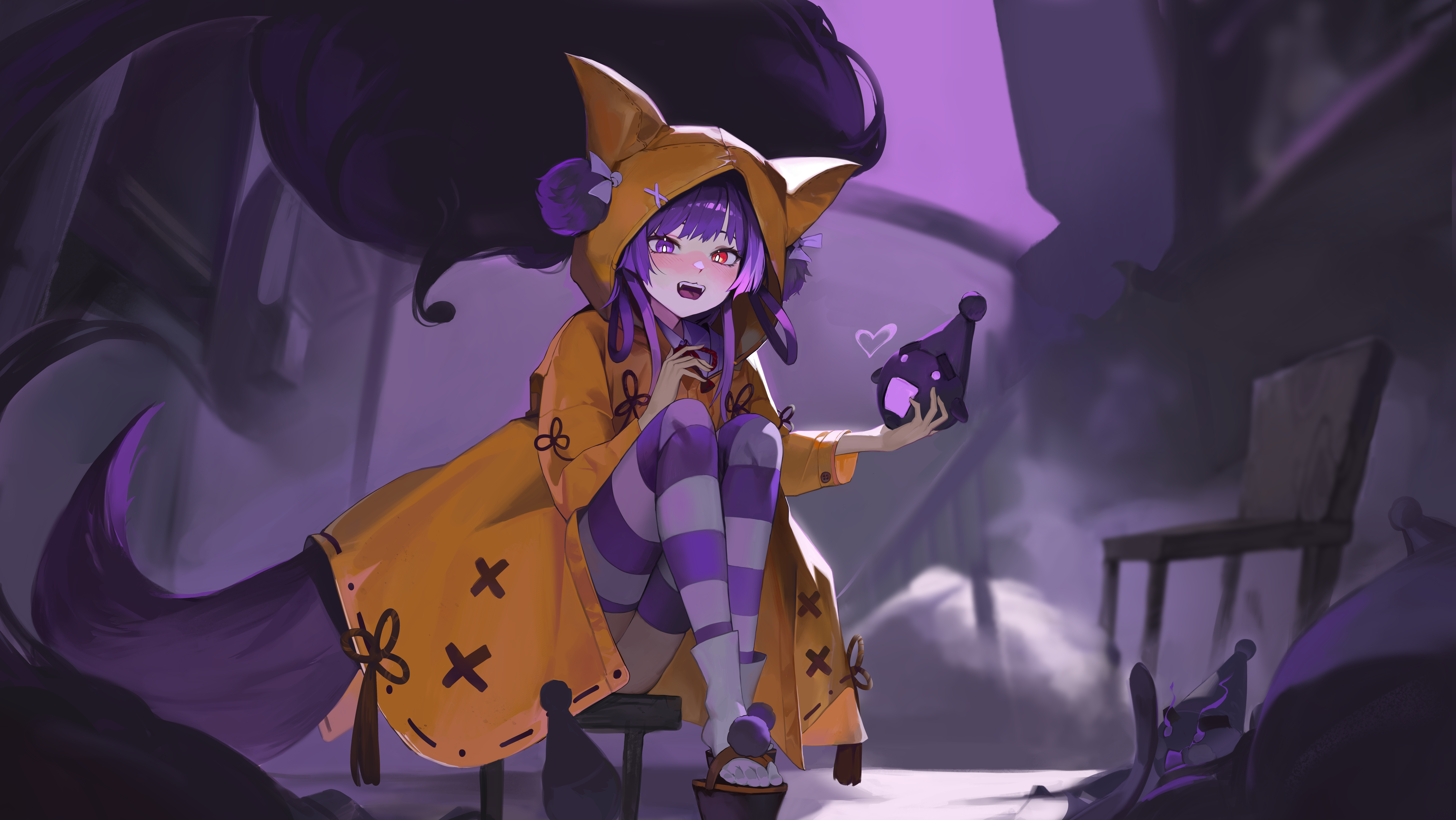 1girlanimal ear hoodbright pupilscoatcreatureeoseoosiofake animal earsfangsfox girlfox tailfull bodyglowingglowing eyesglowing mouthhands upheartheterochromiaholdingholding creaturehoodhorror (theme)inari (tenko shibuki)knees uplong sleeveslooking at vieweron stoolopen mouthpurple eyespurple tailpurple themeraincoatred eyessittingsolostriped clothesstriped thighhighstailthighhighsvirtual youtuberwhite pupilsyellow coatyellow raincoat