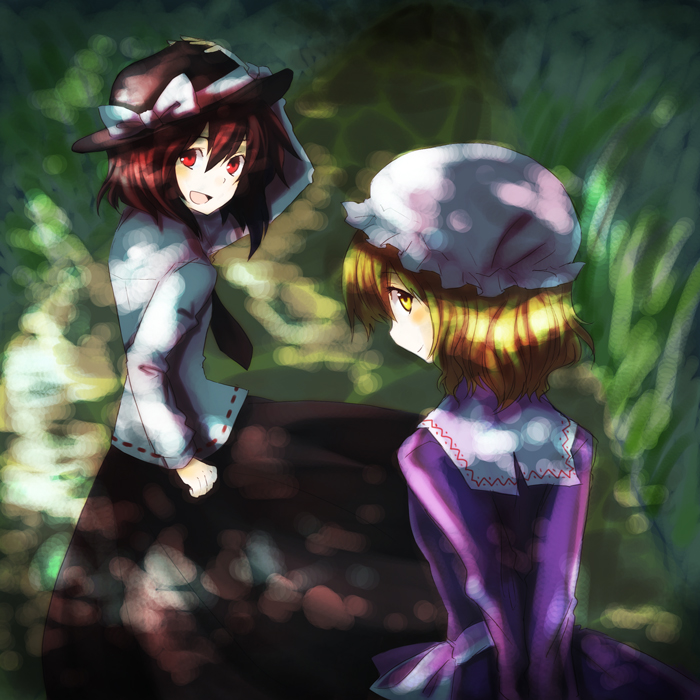 2girlsblonde hairdressfemale focushatmob capmultiple girlsred eyesshort hairsmilestrollyellow eyes